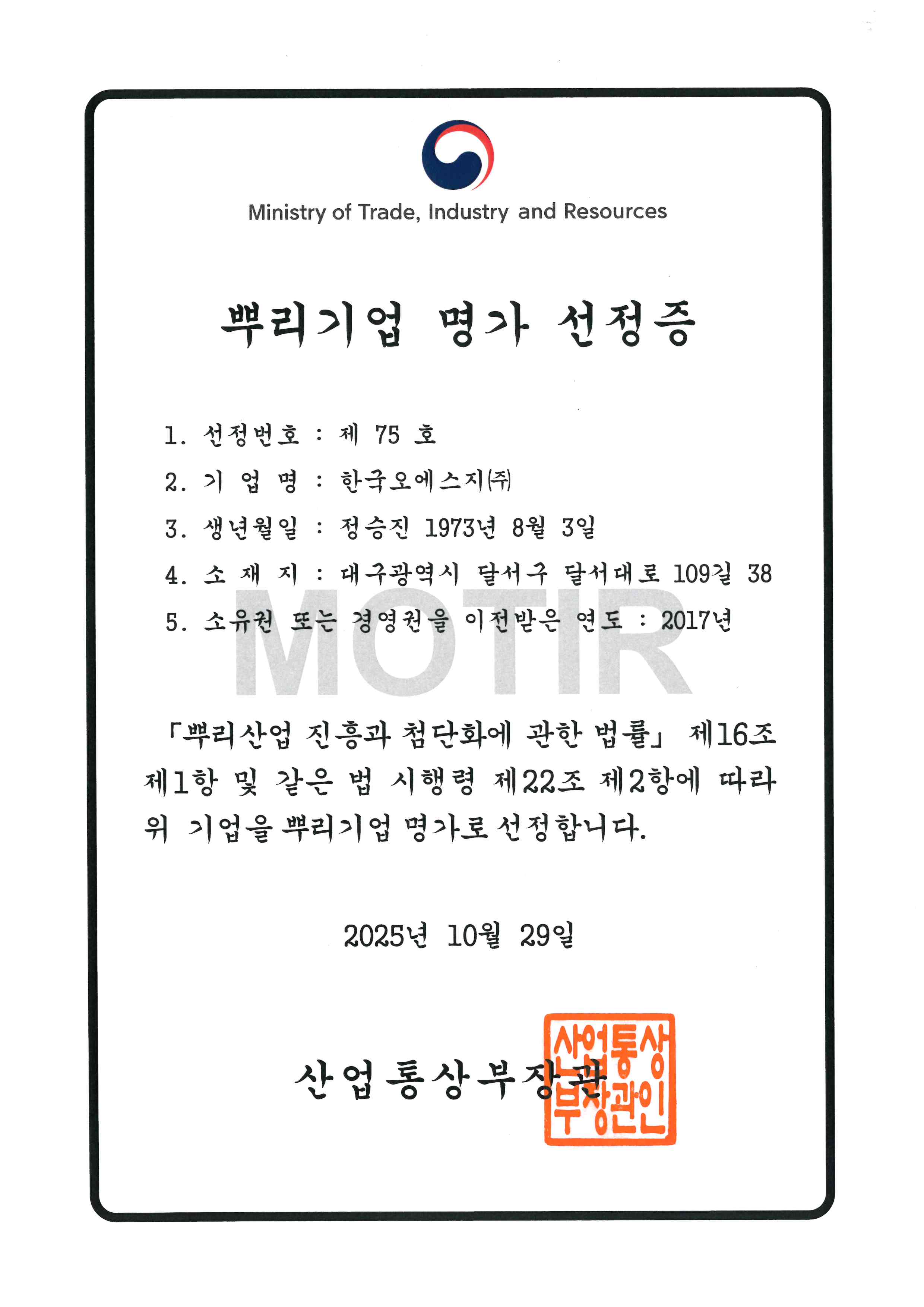 뿌리기업 명가 선정 및 국무총리 표창 수상