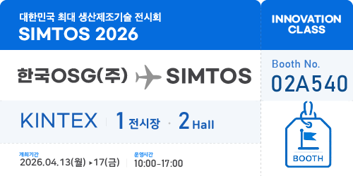 대한민국 최대 생산제조기술 전시회 SIMTOS 2026 생산 제조의 변화를 넘어 AI 자율제조의 혁신을 경험할 SIMTOS 2026의 주인공이 되어보세요! 참관객 사전등록 URL https://simtos.org/kor/pre_regis/step_01.do?userType=u&Invitation=6002373 KINTEX 1전시장.2 HALL 한국OSG 부스번호 : 02A540
